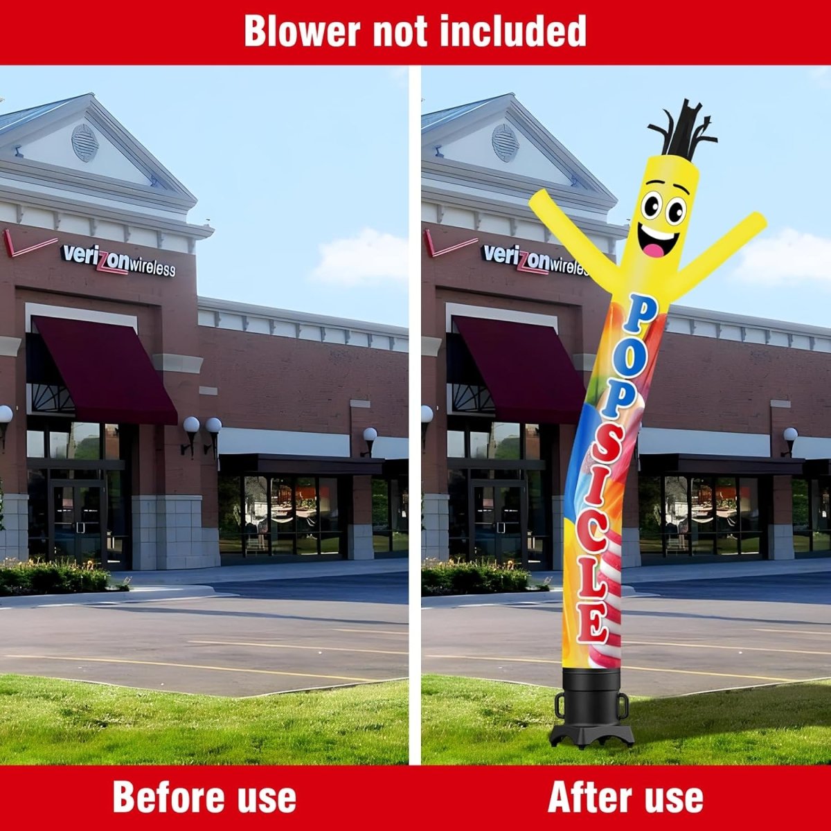 • Specifications: The inflatable dancing man features double-sided printing for maximum visibility. Available in 6ft, 10ft, 15ft, and 20ft heights — each size is designed to fit a specific blower diameter: