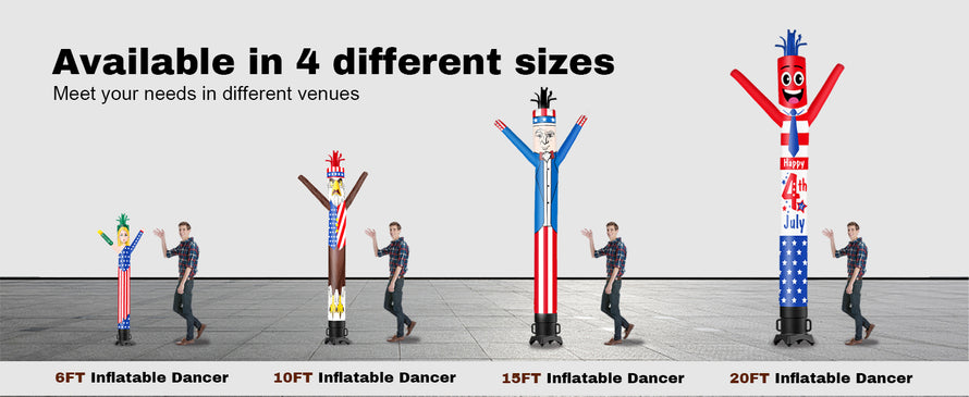 • Specifications: The inflatable dancing man features double-sided printing for maximum visibility. Available in 6ft, 10ft, 15ft, and 20ft heights — each size is designed to fit a specific blower diameter: