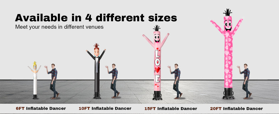 • Specifications: The inflatable dancing man features double-sided printing for maximum visibility. Available in 6ft, 10ft, 15ft, and 20ft heights — each size is designed to fit a specific blower diameter: