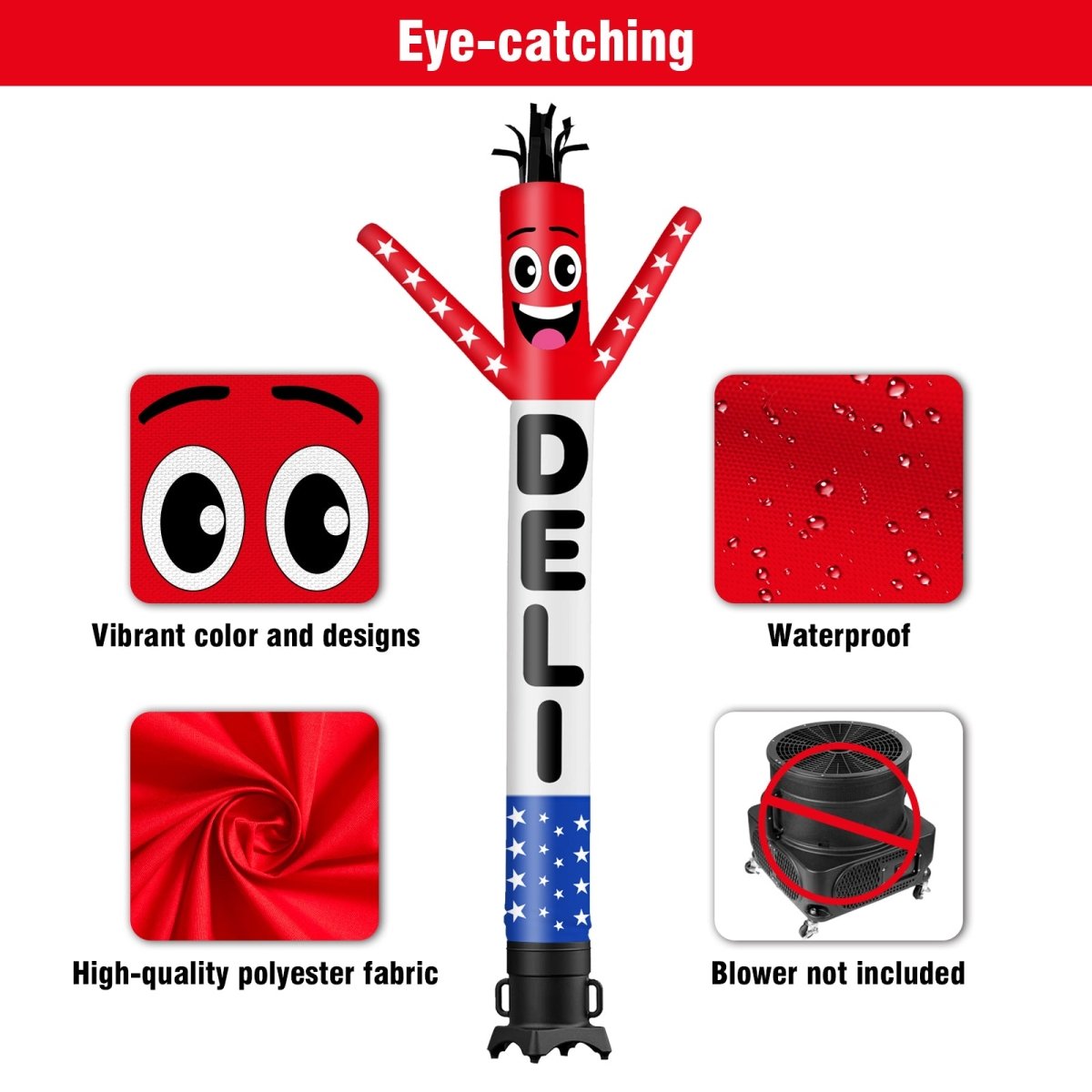 • Specifications: The inflatable dancing man features double-sided printing for maximum visibility. Available in 6ft, 10ft, 15ft, and 20ft heights — each size is designed to fit a specific blower diameter: